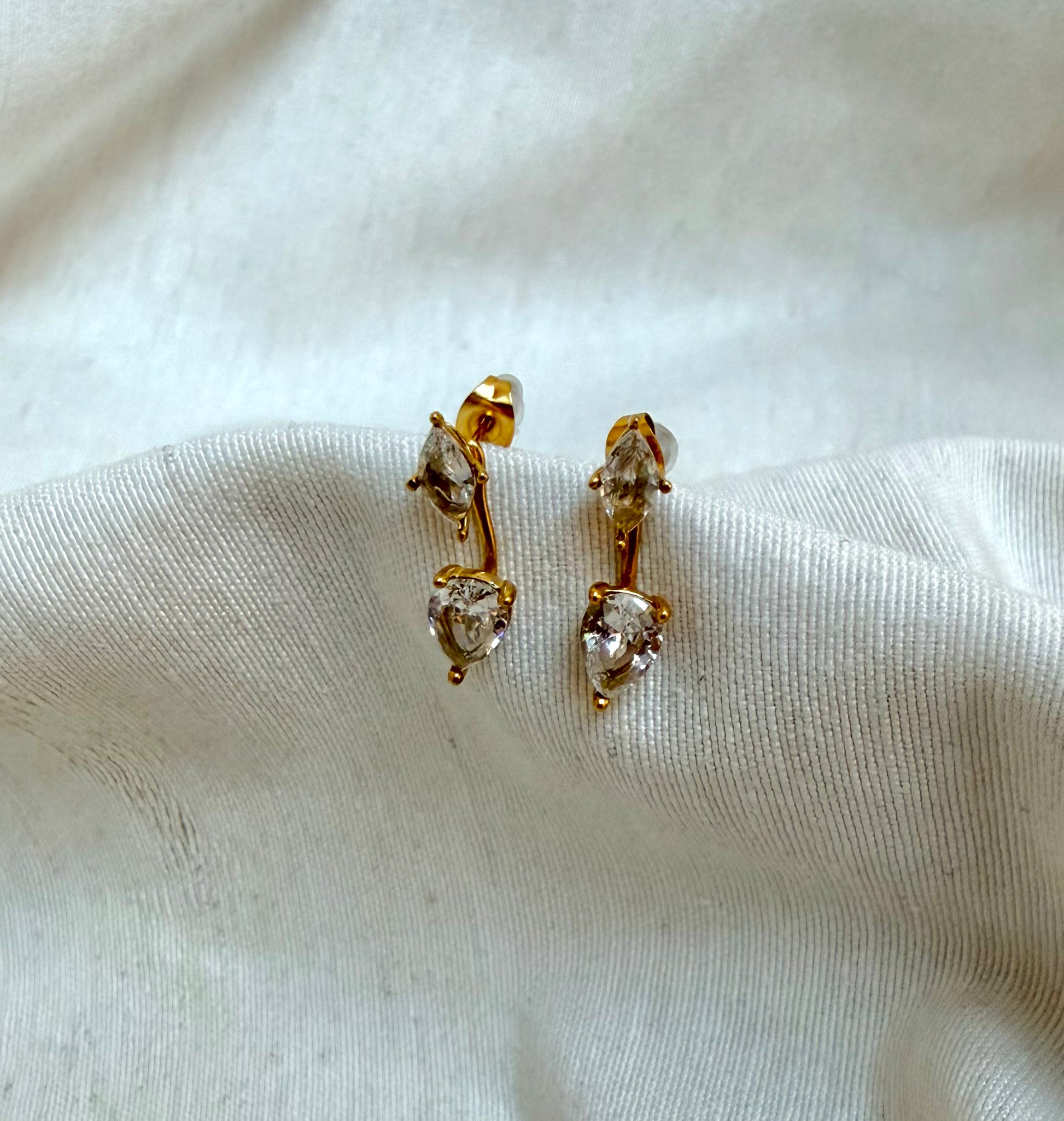 Pendiente tipo piercing con dos circonitas que brillan con elegancia. Diseño minimalista y versátil, perfecto para lucir en cualquier ocasión.