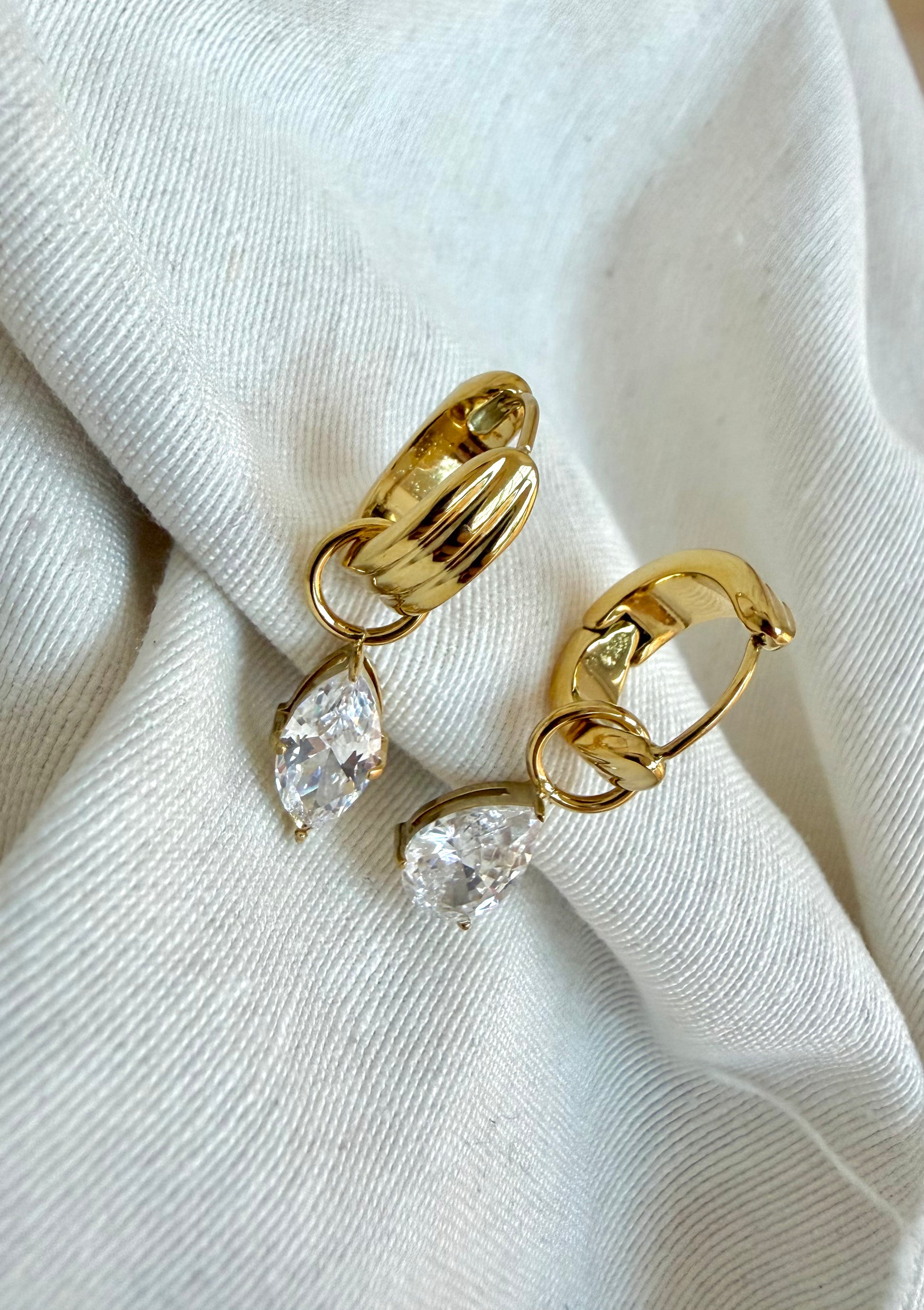Pendientes de aro con un delicado relieve rayado. Cada pieza luce una circonita colgante que añade movimiento y brillo.