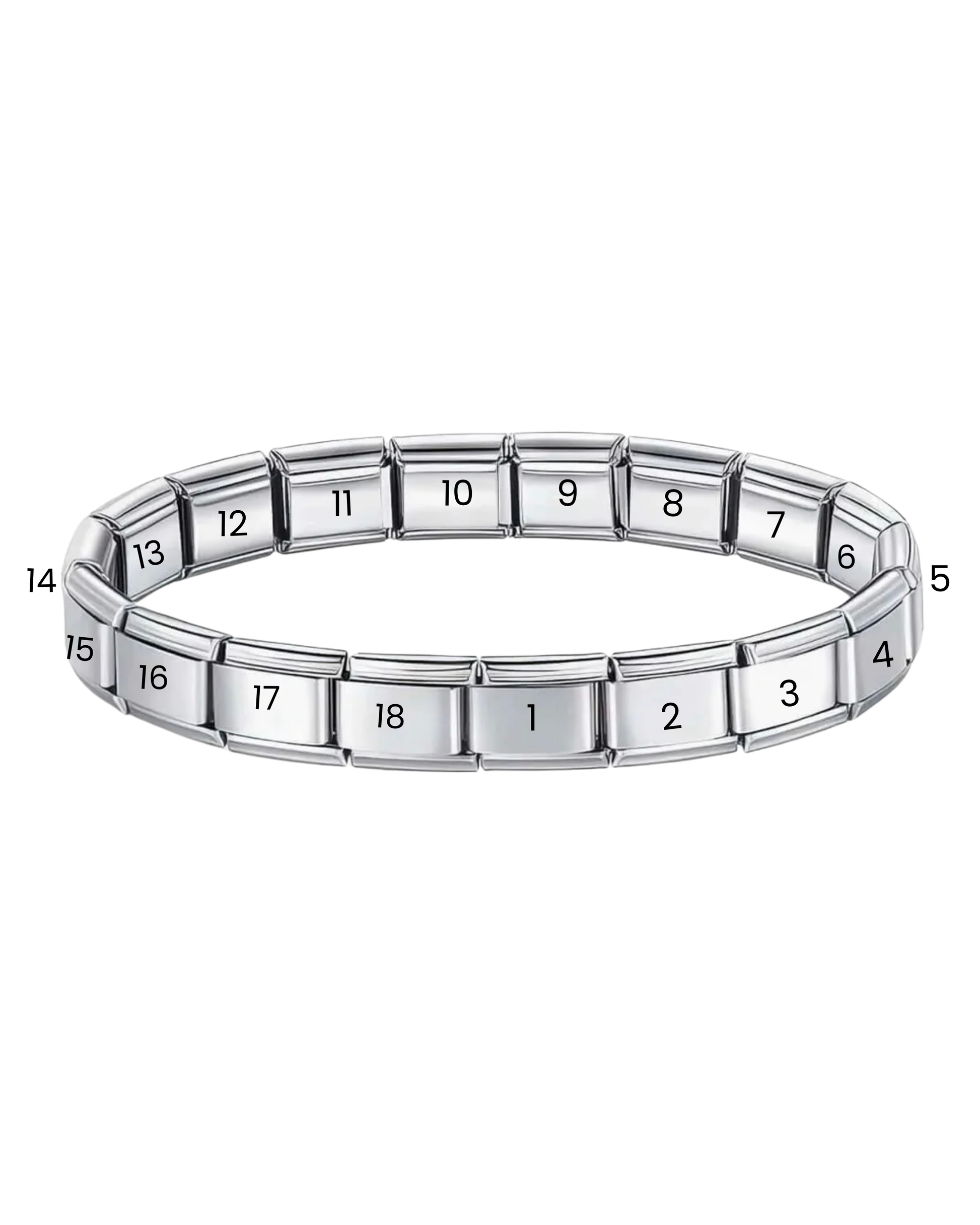 Hemos incluido una imagen de la pulsera con los eslabones numerados del 1 al 18 para que puedas indicarnos cómo quieres montar tu pulsera.